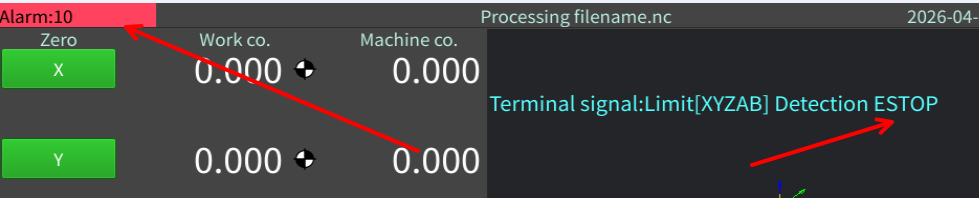 stop signal, i.e. Alarm:10. When the controller is in the emergency stop state, you cannot run the machining program or change settings. You can short the controller’s